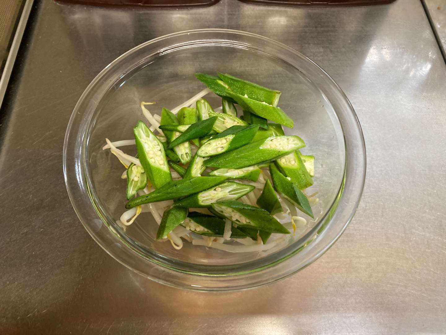 ④ オクラともやしを加えて、混ぜる。